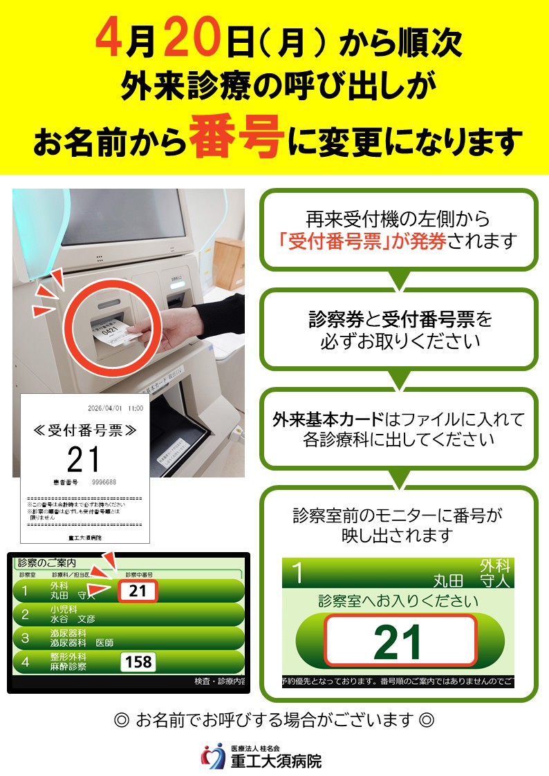 4月20日(月)から、外来診療の呼び出しがお名前から「番号」に変更になります。